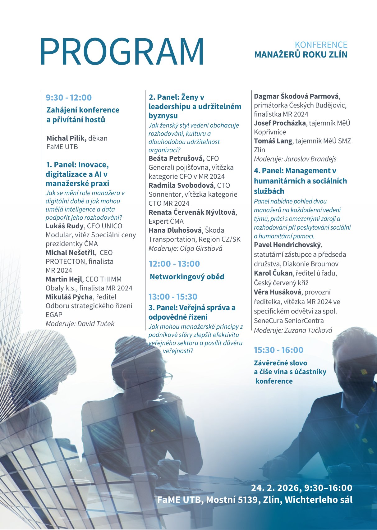 20. ledna 2026Rádi bychom vás pozvali na jedinečnou událost – Konferenci Manažerů roku Zlín, která se bude konat 24. února 2026. Tato akce nabídne jedinečnou příležitost setkat se s finalisty ocenění Manažer roku, předními českými manažery a odborníky z praxe i akademického prostředí.