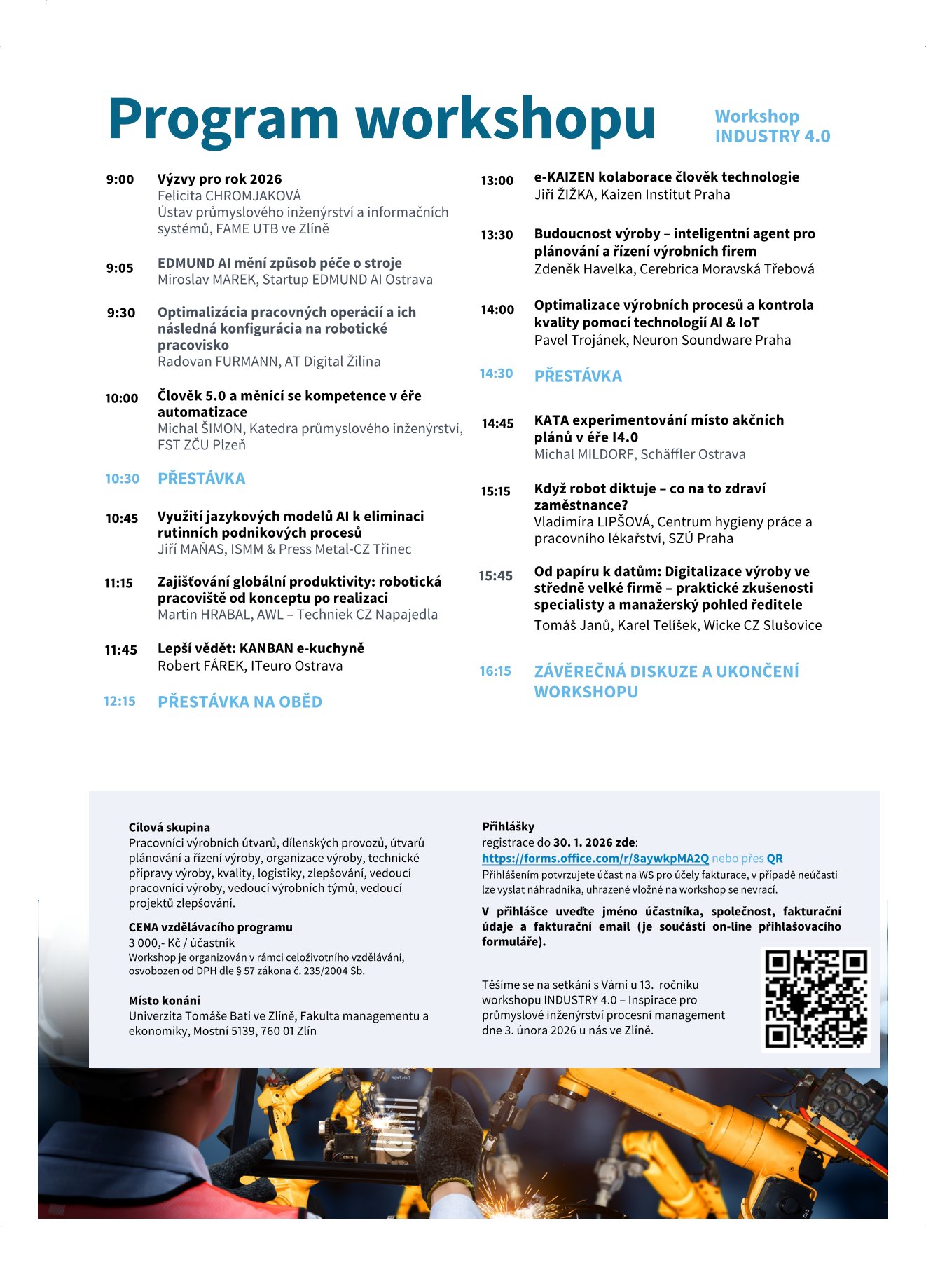 Zveme vás k účasti a ke vzájemné výměně znalostí. Zkušenosti, které si na půdě workshopu můžeme vyměnit, mají pro nás vysokou přidanou hodnotu právě v osobním setkání. Budeme diskutovat o aktuálních novinkách v průmyslových firmách, které jsou jak inspirací, tak i námětem na další rozvoj průmyslových firem.