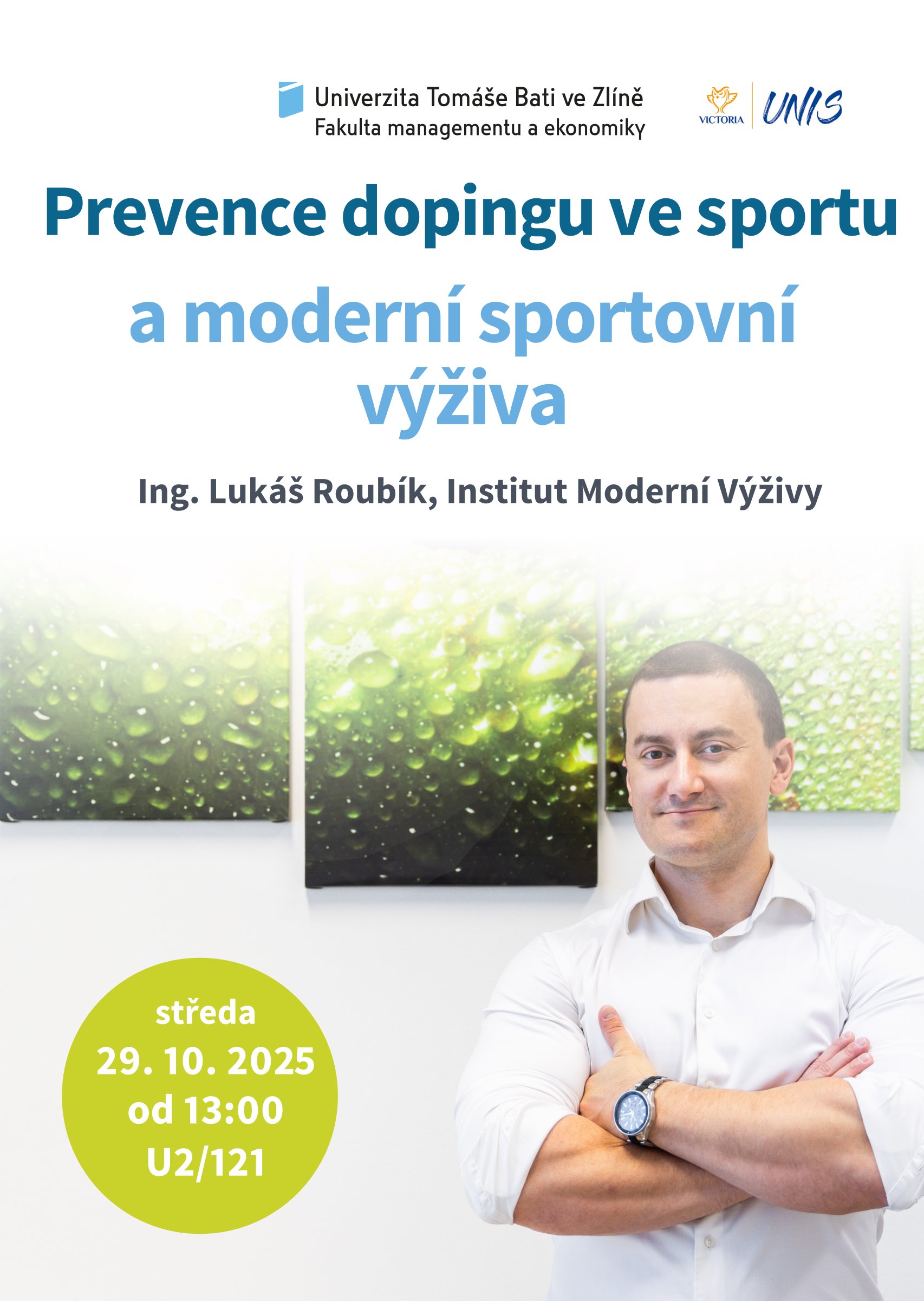 17. října 2025V rámci projektu výzvy UNIS 2025 zveme všechny studenty na odbornou přednášku „Prevence dopingu ve sportu a moderní sportovní výživa“, která se zaměří na aktuální témata spojená s užíváním dopingových látek a moderními trendy ve sportovní výživě.