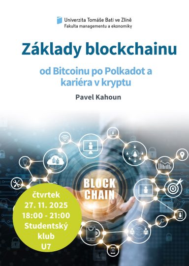 13. listopadu 2025Zajímá vás svět blockchainu, kryptoměn a technologií budoucnosti? Tak to si rozhodně nenechte ujít přednášku Pavla Kahouna s názvem „Základy blockchainu – od Bitcoinu po Polkadot a kariéra v kryptu“, která se uskuteční ve čtvrtek 27. listopadu 2025 od 18:00 do 21:00 hodin ve Studentském klubu U7.
